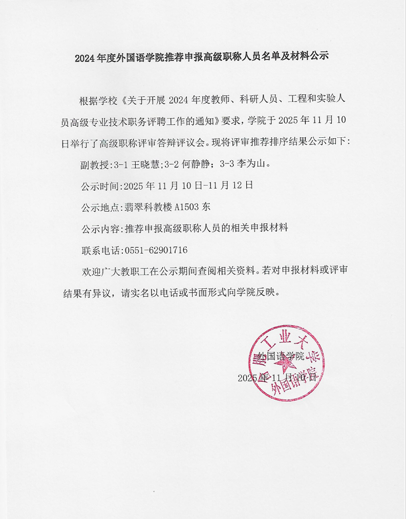 2024年度外国语学院推荐申报高级职称人员名单及材料公示
