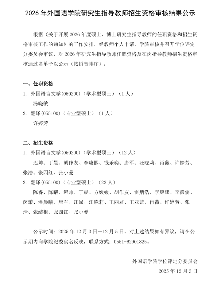2026 年外国语学院研究生指导教师招生资格审核结果公示
