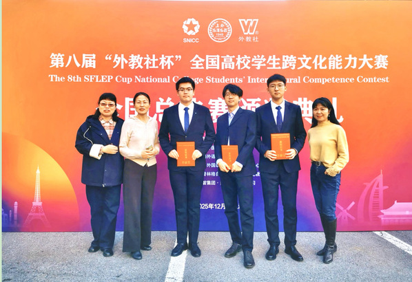 2025年12月11日至14日,第八届“外教社杯”全国高校学生跨文化能力大赛全国总决赛在上海外国语大学落下帷幕。由我校外国语学院曹非未、仪器科学与光电工程学院杨雨轩、数学学院程皓轩三名同学组成的参赛团队,在外国语学院刘丽、张和、孙桂林三位老师的悉心指导下,凭借出色的跨文化理解力、表达力与实践能力,各展所长、协同配合,荣获全国总决赛一等奖。