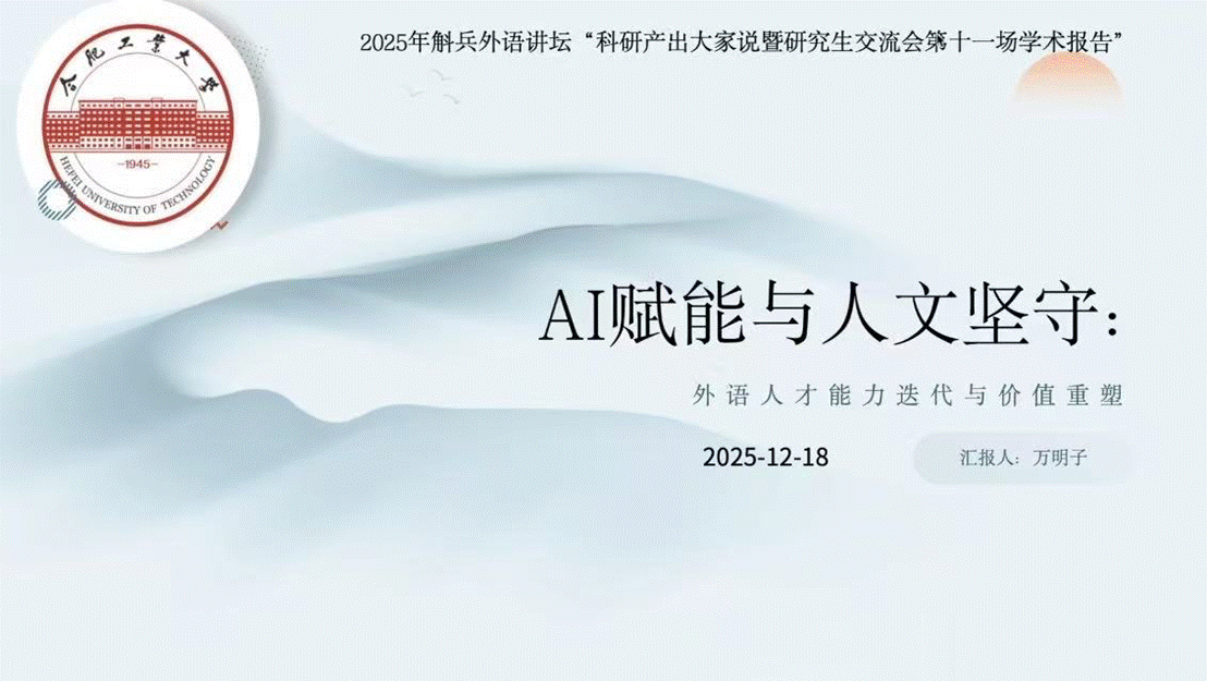 在能力培养方面,万明子老师提出外语人才应具备三项技术基本功:掌握CAT工具、系统进行译后编辑、整合AI工具链;同时需提升三项人文素养:增强国情敏感度、训练受众分析能力、建设文化解释案例库。最后,她以合肥工业大学“厚德、笃学、崇实、尚新”的校训勉励学子,成为融通中外、底蕴深厚的新时代外语人才。