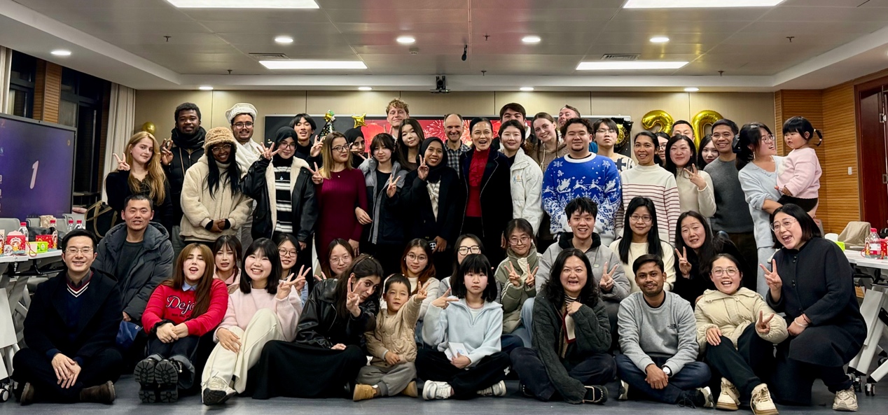 2026年1月7日晚,科教楼A座1208教室装饰一新,学院举办了中外师生新年联欢活动。院长唐军、副院长肖薇、李康熙、国际交流中心主任华啸尘、团委书记赵雰雰及教师代表们与外籍语言教师、本硕留学生、部分中国学生一起,共迎新年,联欢同乐。