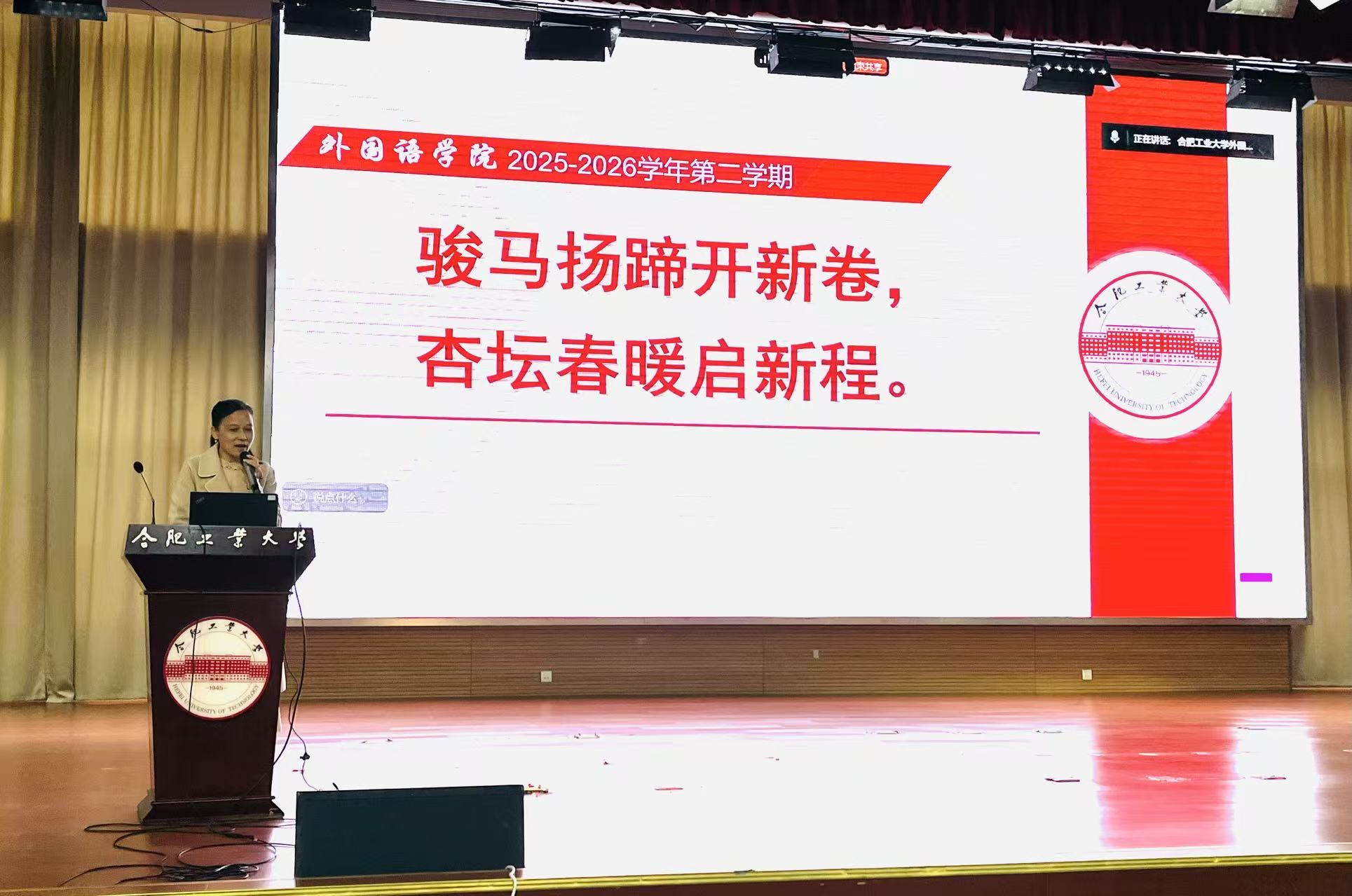 会上,院长兼党委副书记唐军教授代表学院作了题为《骏马扬蹄开心卷,杏坛春暖启新程》的工作报告。她从“既往工作”“核心业绩”“考核指标”“年终绩效”“定位规划”“年度工作”六个维度,系统梳理和全面总结了过去一学期学院在党建与思想政治工作、人才培养质量提升、教学科研创新、学科与专业建设深化、师资队伍优化、学生工作及校友工作推进等方面取得的显著成绩。她强调,学院将紧密对接国家战略需求与学校发展大局,科学谋划“十五五”发展规划,持续深化“语契学术、语融科技、语传中国”的特色外语教学改革,着力构建科技教育深度融入的文科专业课程体系,为学校理工科特色人才培养体系贡献外语力量。此外,她还就打造“工业报国精神+学院文化”育人共同体、加强人才梯队建设、培育标志性教科研成果等重点工作进行了专项布置。她勉励全体教职工丙午腾骧开视野,文心交融启新篇。