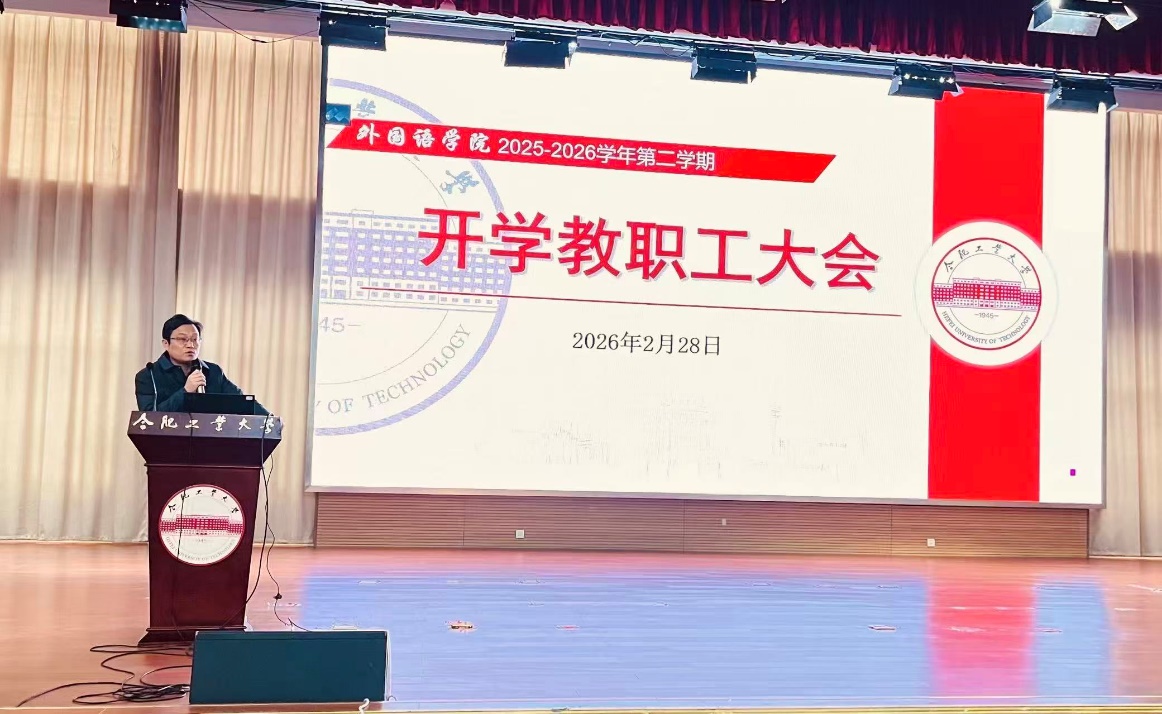2026年2月28日上午,学院在翡翠科教楼A座二楼报告厅举行2025-2026学年第二学期教职工大会。会议由学院党委书记刘晓峰主持,学院全体教职工现场参会,宣城校区英语系教师线上同步参加。