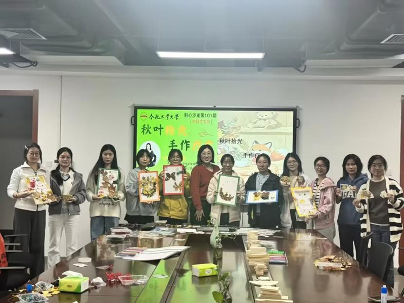 秋意渐浓,叶落如诗。11月12日,由校心理健康教育与咨询中心主办、外国语学院承办的第101期“斛心沙龙”心理品牌活动在宁静温馨的氛围中圆满举行。本期活动以“秋叶拾光·手作疗愈”为主题,同学们以落叶与干花为素材,亲手创作秋日贴画,在自然与艺术的交融中释放情绪、疗愈心灵,活动由外国语学院团委书记赵雰雰老师主持。