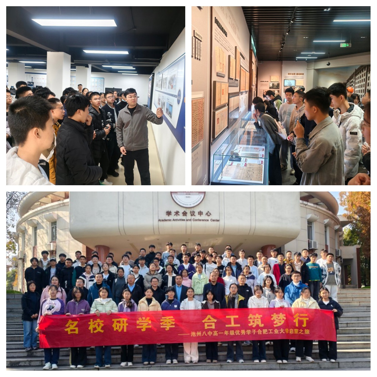 在志愿者的引导下,来访师生先后参观了安徽省智慧交通车路协同工程研究中心和合肥工业大学校史馆。在工程研究中心,同学们近距离感受智能交通领域的前沿技术;在校史馆,大家通过珍贵史料了解了合工大的办学传统与育人成就。最后,全体师生齐聚学术会议中心二楼报告厅,听取了外国语学院李康熙、张结根两位老师的招生专题介绍,以及刘乙熳、雷威祺两位同学的学习生活分享。学院负责池州地区招生工作的杨勇老师也参与了交流环节。