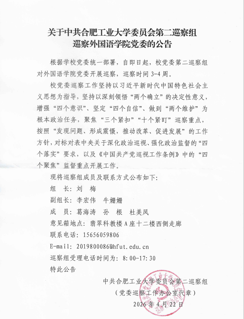 关于中共合肥工业大学委员会第二巡察组巡察外国语学院党委的公告